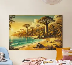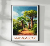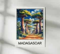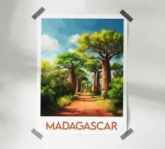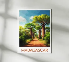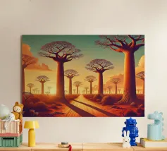 Poster dal Madagascar che raffigura il famoso viale dei baobab sotto un cielo blu brillante. Questa calda ed esotica opera d'arte da parete è ideale per gli amanti dei paesaggi unici e della natura esotica.