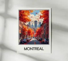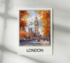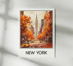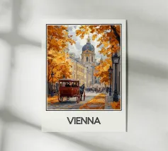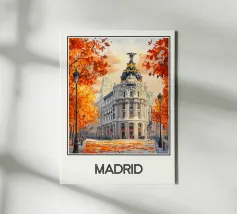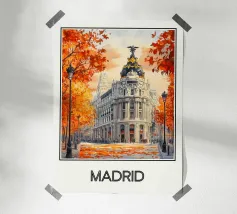 Un'elegante illustrazione della Gran Vía di Madrid, con i suoi edifici iconici circondati da fogliame dai vivaci colori autunnali. Una calda scena urbana che cattura l'essenza storica e vibrante della capitale spagnola, perfetta per una raffinata decorazione murale.