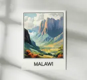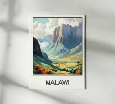 Scoprite la bellezza naturale del Malawi con questa illustrazione che ritrae una valle verdeggiante circondata da imponenti montagne. Con la sua luce dorata e la vegetazione lussureggiante, questo imponente paesaggio è un invito alla fuga e alla contemplazione, ideale per una decorazione stimolante e rilassante.