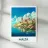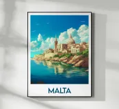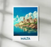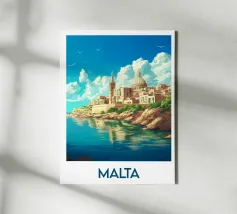 Poster di Malta che raffigura la soleggiata costa di La Valletta, tra acque cristalline e cieli azzurri. Un'illustrazione ideale per una decorazione murale ricca di fascino mediterraneo e di evasione.