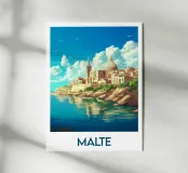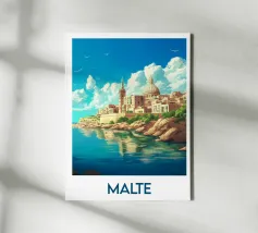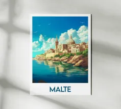 Poster di Malta con una splendida vista delle scogliere e degli edifici storici di La Valletta sotto un cielo luminoso. Un poster ideale per un'atmosfera mediterranea e una decorazione murale luminosa.