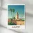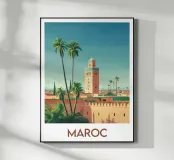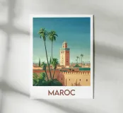 Poster marocchino che mostra la maestosa Koutoubia di Marrakech circondata da palme sotto un cielo limpido. Un'illustrazione ideale per una decorazione murale elegante e piena di calore orientale.