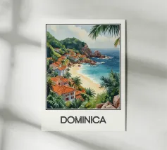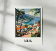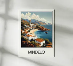 Ammirate la bellezza di Mindelo, una città costiera di Capo Verde, con questo poster che presenta case bianche con tetti rossi, una spiaggia tranquilla e montagne sullo sfondo. Un invito a viaggiare e a scoprire questo gioiello insulare.