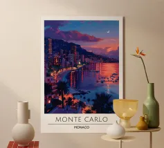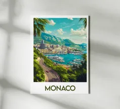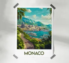 Poster di Monaco che illustra la famosa vista del porto di Monte-Carlo, i suoi lussuosi yacht, le montagne verdeggianti e un'iconica strada tortuosa. Una decorazione murale ideale per un ambiente chic e mediterraneo.