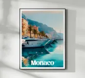 Poster artistico di Monaco con un porto costeggiato da yacht di lusso, eleganti palme e la costa mediterranea sullo sfondo. Un'illustrazione luminosa che cattura lo spirito chic e raffinato del principato, perfetta per una decorazione murale ispirata ai viaggi e all'eleganza.