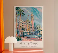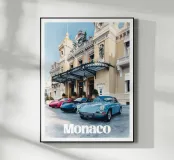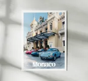 Poster artistico di Monaco che raffigura l'iconico Casinò di Monte Carlo con auto di lusso parcheggiate al suo ingresso. Un'illustrazione raffinata che cattura il glamour e l'eleganza del principato, ideale per una decorazione murale che evoca prestigio e stile.