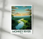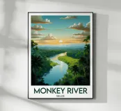 Affiche de voyage présentant Monkey River au Belize, avec sa rivière sinueuse traversant une jungle luxuriante, baignée par les lumières dorées d'un coucher de soleil tropical.
