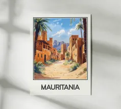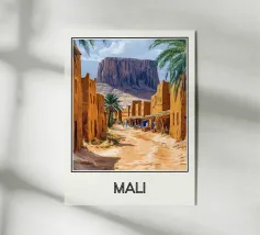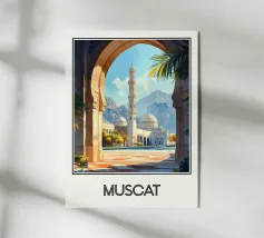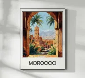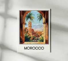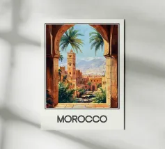 Un'illustrazione accattivante che cattura l'essenza del Marocco attraverso un arco di pietra, rivelando una vibrante medina fiancheggiata da palme e dominata da un iconico minareto. All'orizzonte, le cime innevate delle montagne dell'Atlante contrastano con l'architettura ocra della città. Un poster perfetto per una decorazione murale ispirata ai viaggi e all'Oriente.