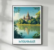 Un maestoso tempio circondato dal verde, riflesso nelle calme acque di un lago in Birmania. Un'illustrazione pacifica e spirituale, perfetta per una decorazione murale esotica e zen.