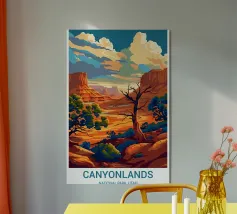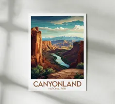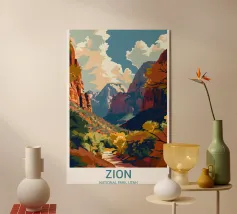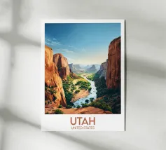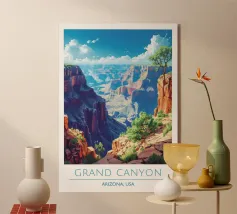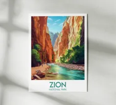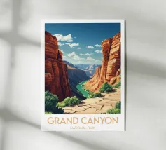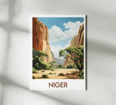 Affiche artistique du Niger montrant un canyon spectaculaire bordé de falaises rouges et de végétation sahélienne. Une décoration murale inspirante qui évoque la beauté naturelle et sauvage de l’Afrique.