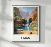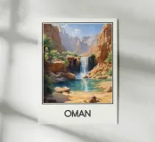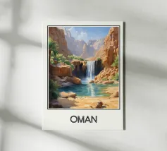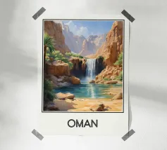 Un magnifico poster che raffigura un paesaggio naturale dell'Oman, con una maestosa cascata circondata da scogliere rocciose e vegetazione lussureggiante. Un contrasto sorprendente tra l'aridità del deserto e la freschezza di un vero paradiso nascosto.