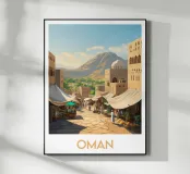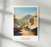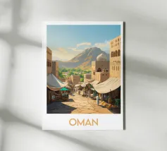 Poster dall'Oman, una vivace illustrazione di un tradizionale mercato orientale ai piedi delle montagne. Perfetto per una decorazione murale autentica ed esotica.