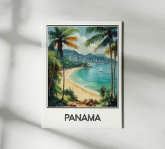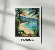 Un'illustrazione tropicale della spiaggia di Panama, con palme lussureggianti, sabbia dorata e una vista di grattacieli sullo sfondo. Un modo ideale per evocare l'esotismo e il fascino dell'America centrale.