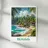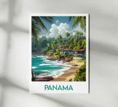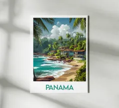 Poster di Panama, un'illustrazione tropicale di una costa fiancheggiata da case colorate e maestose palme. Ideale per una decorazione murale esotica e solare.