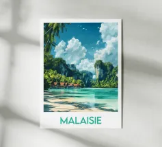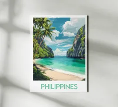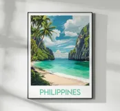 Affiche des Philippines, une magnifique illustration d’une plage paradisiaque entourée de falaises majestueuses et d’eaux turquoise. Parfaite pour une décoration murale exotique et dépaysante.