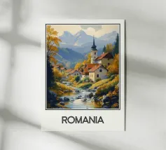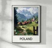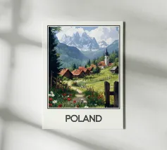 Un magnifico poster che raffigura un pittoresco villaggio in Polonia, incastonato tra prati fioriti e maestose montagne. Un'ambientazione incantevole che illustra la serenità e l'autenticità della campagna polacca.