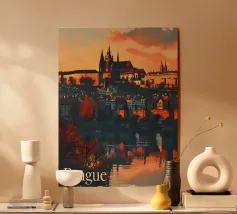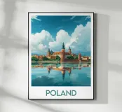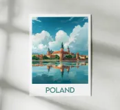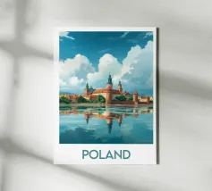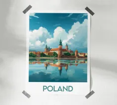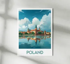 Affiche de la Pologne, une illustration élégante d’un château historique aux toits rouges, se reflétant sur une rivière paisible sous un ciel nuageux. Parfaite pour une décoration murale classique et raffinée.