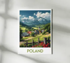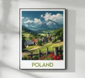 Poster dalla Polonia, una magnifica illustrazione di un villaggio alpino circondato da maestose montagne e prati fioriti. Ideale per creare un'atmosfera naturale e rilassante nella vostra decorazione murale.