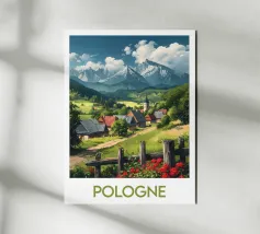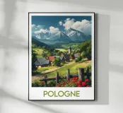 Poster di viaggio che raffigura un tradizionale villaggio polacco circondato da maestose montagne e paesaggi verdeggianti. L'illustrazione perfetta per aggiungere un tocco di natura, evasione e autenticità alla vostra decorazione murale.