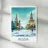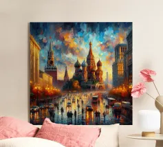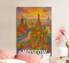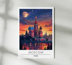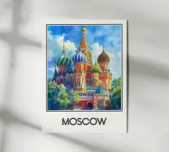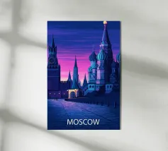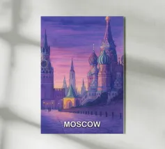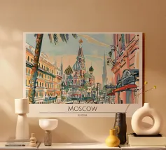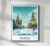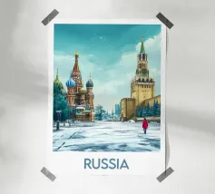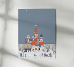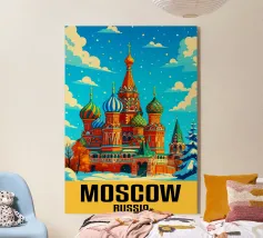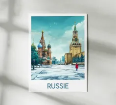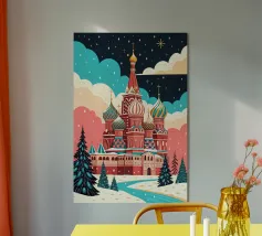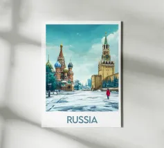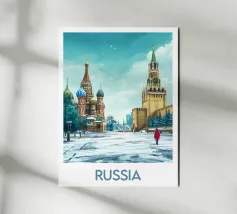 Poster di viaggio che mostra la famosa Piazza Rossa di Mosca sotto la neve, con la Cattedrale di San Basilio e la Torre del Cremlino. Un'illustrazione perfetta per aggiungere un'atmosfera maestosa, storica e invernale alla vostra decorazione murale.