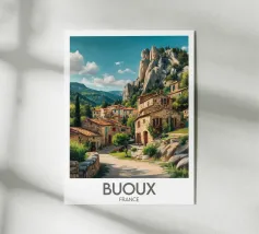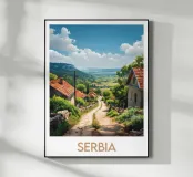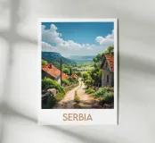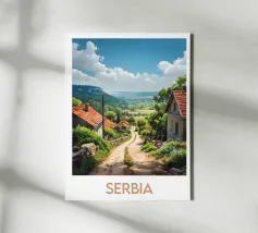 Poster di viaggio che raffigura un incantevole villaggio in Serbia circondato da verdi colline e stradine di campagna sotto un cielo blu brillante. Un'illustrazione perfetta per aggiungere un'atmosfera rurale, autentica e naturale alla vostra decorazione murale.