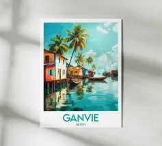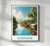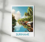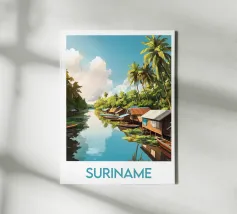 Un'illustrazione luminosa di un tranquillo villaggio sull'acqua in Suriname, circondato da palme e da una natura rigogliosa. Perfetta per una decorazione murale che evoca la tranquillità e l'evasione tropicale.