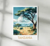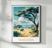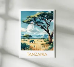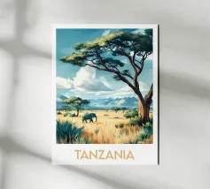 Poster di viaggio raffigurante la Tanzania, con le sue vaste savane dorate, le maestose acacie e un elefante in libertà. Perfetto per una decorazione murale esotica e selvaggia.