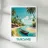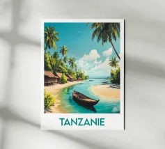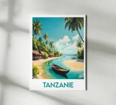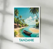 Poster di viaggio che mostra la Tanzania con le sue spiagge orlate di palme, le acque turchesi e le imbarcazioni tradizionali. Ideale per una decorazione murale esotica e rilassante.
