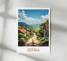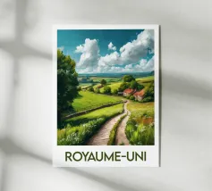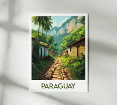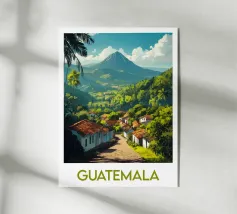 Poster di viaggio che raffigura l'Uganda, con i suoi paesaggi ondulati, le strade sterrate costeggiate da palme e le case tradizionali. Ideale per una decorazione murale naturale e autentica.