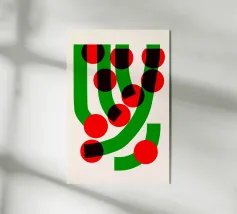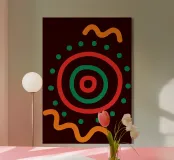 Un audace disegno astratto è caratterizzato da cerchi concentrici rossi e verdi, circondati da punti verdi. Due linee arancioni ondulate aggiungono un movimento dinamico alla composizione.