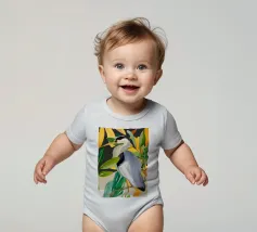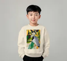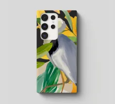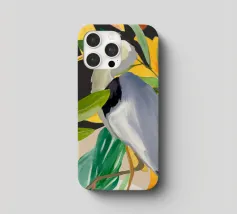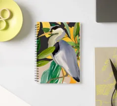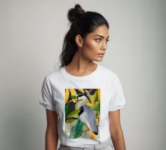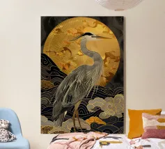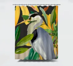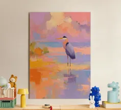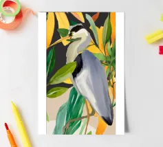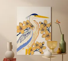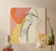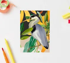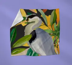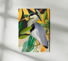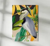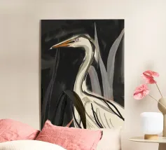 Raffigurazione dipinta di un airone in mezzo alla vegetazione naturale, resa con toni morbidi ed equilibrati.