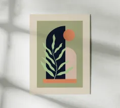 Un'opera d'arte sognante di ispirazione boho con un elegante arco che incornicia montagne mistiche, fogliame estetico e una luna luminosa. I toni della terra e le forme organiche creano un'atmosfera rilassante e libera.