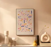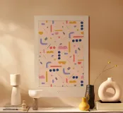 Uno sfondo beige con un motivo geometrico astratto e colorato. Il disegno presenta varie forme, tra cui rettangoli arrotondati, punti, linee ed elementi curvi nei toni del rosa, del blu, del giallo e dell'arancione. La disposizione delle forme è giocosa e casuale e conferisce all'immagine un'atmosfera moderna e artistica che ricorda il design di metà secolo. Questo motivo è ideale per progetti creativi, design tessile e grafica.