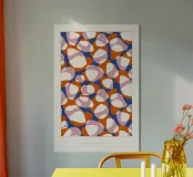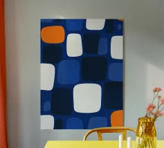 Motivo astratto con forme organiche simili a ciottoli di varie dimensioni. Il disegno presenta elementi stratificati nei toni dell'arancio, del rosa e del crema su uno sfondo blu intenso. Le forme sovrapposte creano un aspetto dinamico e fluido che ricorda le pietre naturali o l'arte astratta. Questo motivo è perfetto per tessuti, carta da parati o arte digitale, con la sua palette di colori vivaci e la composizione fluida che crea un'estetica audace e moderna.
