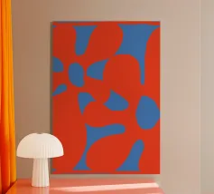 Forme astratte con forme audaci e fluide in rosso e blu creano una composizione vibrante e dinamica. L'aggiunta di linee gialle aggiunge contrasto e movimento al disegno.
