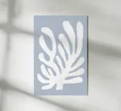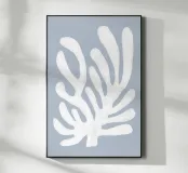 Opera d'arte minimalista con alghe bianche astratte o forme simili a coralli su uno sfondo grigio-blu tenue. Perfetto per un'estetica moderna e organica.