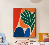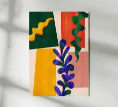 Un'audace composizione astratta presenta forme organiche in vibranti tonalità di arancio, blu e verde. Una grande forma verde simile a una foglia contrasta con il caldo sfondo arancione e rosso.