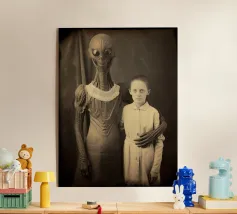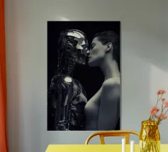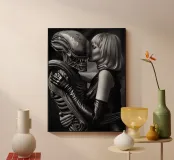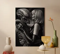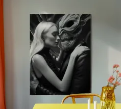La Bella e la Bestia è un tema antico dell'arte. Questa fotografia in bianco e nero riprende il tema e lo illumina in modo nuovo: una storia d'amore tra un alieno inquietante e una bella donna bionda. Un vero e proprio colpo d'occhio. Disponibile come stampa su vari materiali, con o senza cornice.