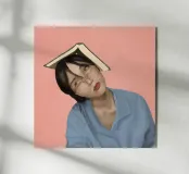A whimsical portrait of a young woman in oversized glasses and a relaxed blue shirt, with an open book balanced playfully on her head. Set against a soft pink background, the illustration blends humor and quiet perseverance, perfect for students, book lovers, and anyone who’s ever felt “almost there.” Ideal for study spaces, dorms, or thoughtful gifts.