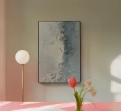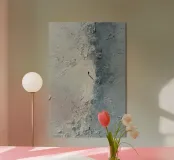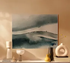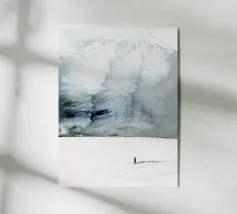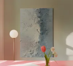 Quest'opera astratta minimalista presenta una figura umana solitaria vista dall'alto, che cammina attraverso una vasta distesa strutturata di bianco e blu pallido. Le pennellate spesse e scultoree evocano ghiaccio, pietra o terreni erosi dal vento, creando un senso tattile di scala e isolamento. Il contrasto tra la piccola figura e la superficie monumentale enfatizza i temi della solitudine, della resilienza e della tranquilla introspezione. La tavolozza di colori sobri e la texture pesante invitano a una lenta contemplazione, rendendo questo pezzo ideale per interni moderni, collezioni concettuali o spazi tranquillizzanti che apprezzano la profondità e la quiete.