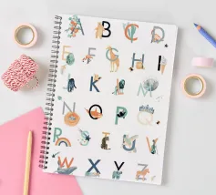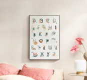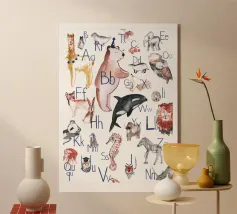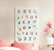 Alfabeto colorato, ogni lettera ha la sua piccola illustrazione. Colori pastello, perfetti per la cameretta.