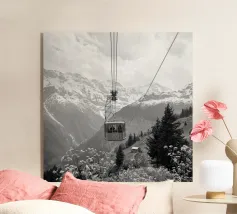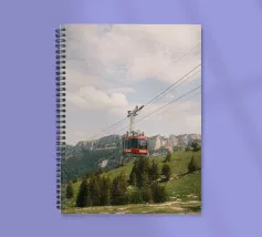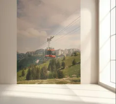 Una funivia in stile vintage scivola attraverso le Alpi svizzere mozzafiato, sospesa sopra prati verdeggianti punteggiati da alberi sempreverdi. Le drammatiche scogliere calcaree e il paesaggio alpino pastorale creano una miscela perfetta di avventura e tranquillità. Questa nostalgica scena di montagna cattura l'essenza del turismo alpino europeo e il fascino senza tempo delle ferrovie di montagna.