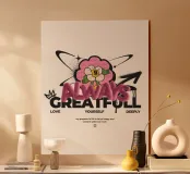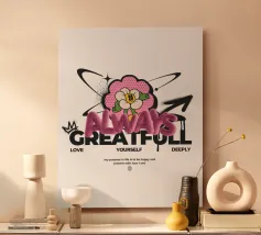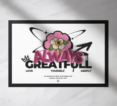 Produktbeschreibung: Ein Design voller Positivität und kreativer Energie! Dieses Street-Art-Motiv zeigt eine fröhliche Blumen-Cartoon-Figur vor den ikonischen Saturn-Ringen. Der Schriftzug „ALWAYS GREATFULL“ kombiniert eine verspielte, flauschige Textur mit einem cleveren Wortspiel, das Freude und Dankbarkeit ausdrückt. Eine harmonische Verbindung aus Urban Art und Fantasie, die ein Lächeln zaubert und inspiriert. Details: Designstil: Street-Art mit humorvollem Cartoon-Flair und kosmischem Touch. Botschaft: Erinnert daran, das Leben mit Dankbarkeit und Freude zu feiern.