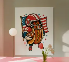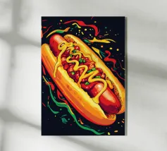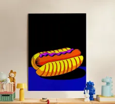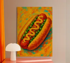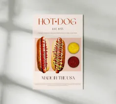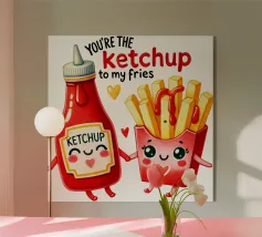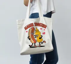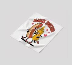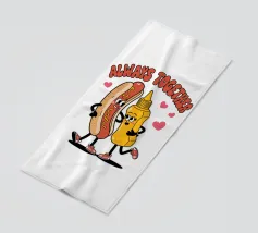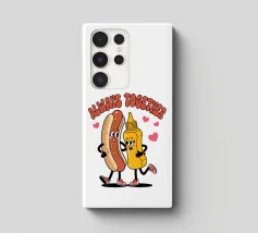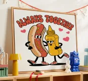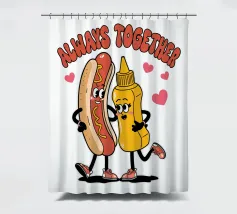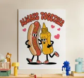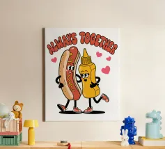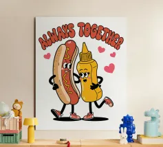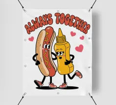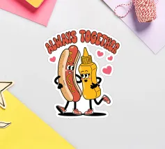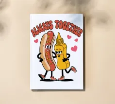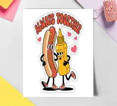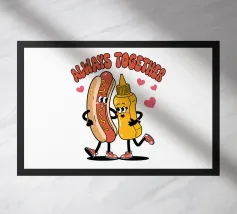 Un'illustrazione giocosa presenta un hot dog e una bottiglia di senape antropomorfi, entrambi con grandi sorrisi e occhi, in piedi uno accanto all'altro con le braccia avvolte l'una all'altra. Sopra di loro, la frase "SEMPRE INSIEME" è circondata da cuori rosa.