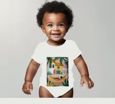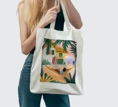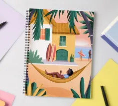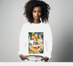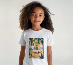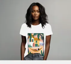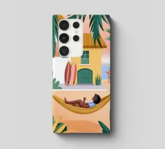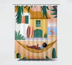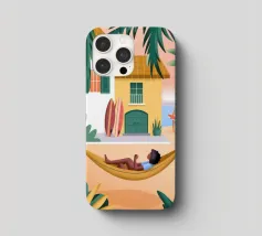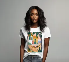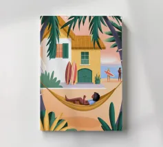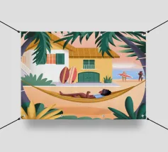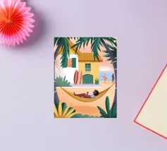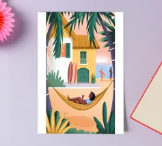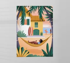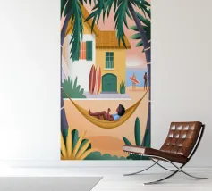 Una persona si sta rilassando su un'amaca in un cortile soleggiato con palme e una casa gialla, trasmettendo un senso di svago e tranquillità.