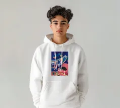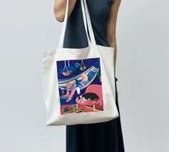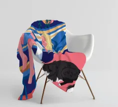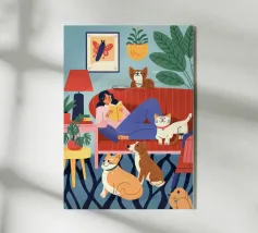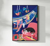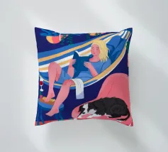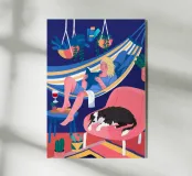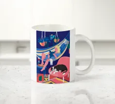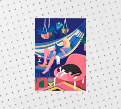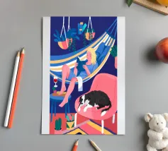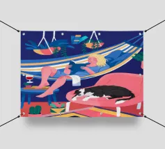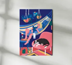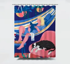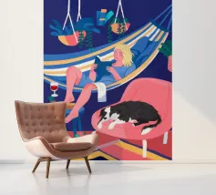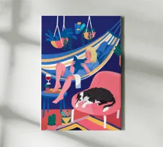 Questa vivace scena raffigura due persone che si rilassano su un'amaca con un cane vicino. Le luci a corda, un bicchiere di vino e l'ambiente colorato aggiungono un vivace senso di svago e gioia.