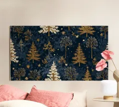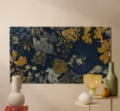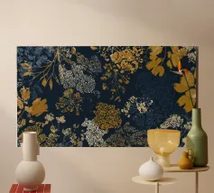 Un luminoso gioco di ocra dorati e blu profondo crea un campo botanico celestiale. Morbidi grappoli di fiori e foglie strutturate si disperdono come costellazioni, fondendo forme naturali e ritmi astratti.