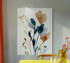 Elegante nella sua sobrietà, questo acquerello botanico moderno presenta steli di colore ambra e blu inchiostro che si ergono in una delicata armonia. La pennellata fluida e la composizione minimalista conferiscono una calma organica agli interni contemporanei, ideale per pareti di gallerie curate, spazi ispirati alle terme o accoglienti angoli di lettura.