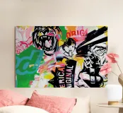 Le opere di Josh Ruggs guardano in modo satirico al sogno americano e a tutti i discorsi sociali, politici e culturali che vi ruotano attorno. Utilizza oggetti familiari di uso quotidiano, celebrità ed estetica comica, chiaramente nella tradizione della Pop Art, come strumenti per visualizzare queste narrazioni della cultura di massa, del consumo e del culto della personalità. Per creare le sue immagini multistrato, l'americano lavora con spray, pittura acrilica, olio, inchiostro e praticamente con ogni superficie che gli capiti sotto mano.