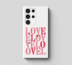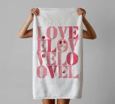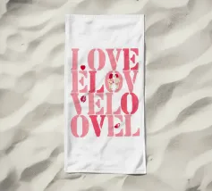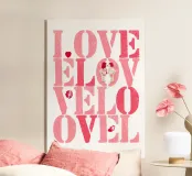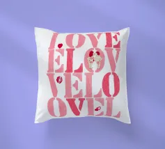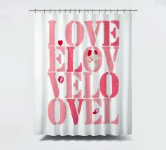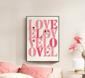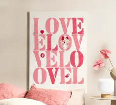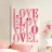 Scritta "Love" in tonalità rosa con lettere stampate con stencil con cuoricini, coppia, impronte di labbra e baci